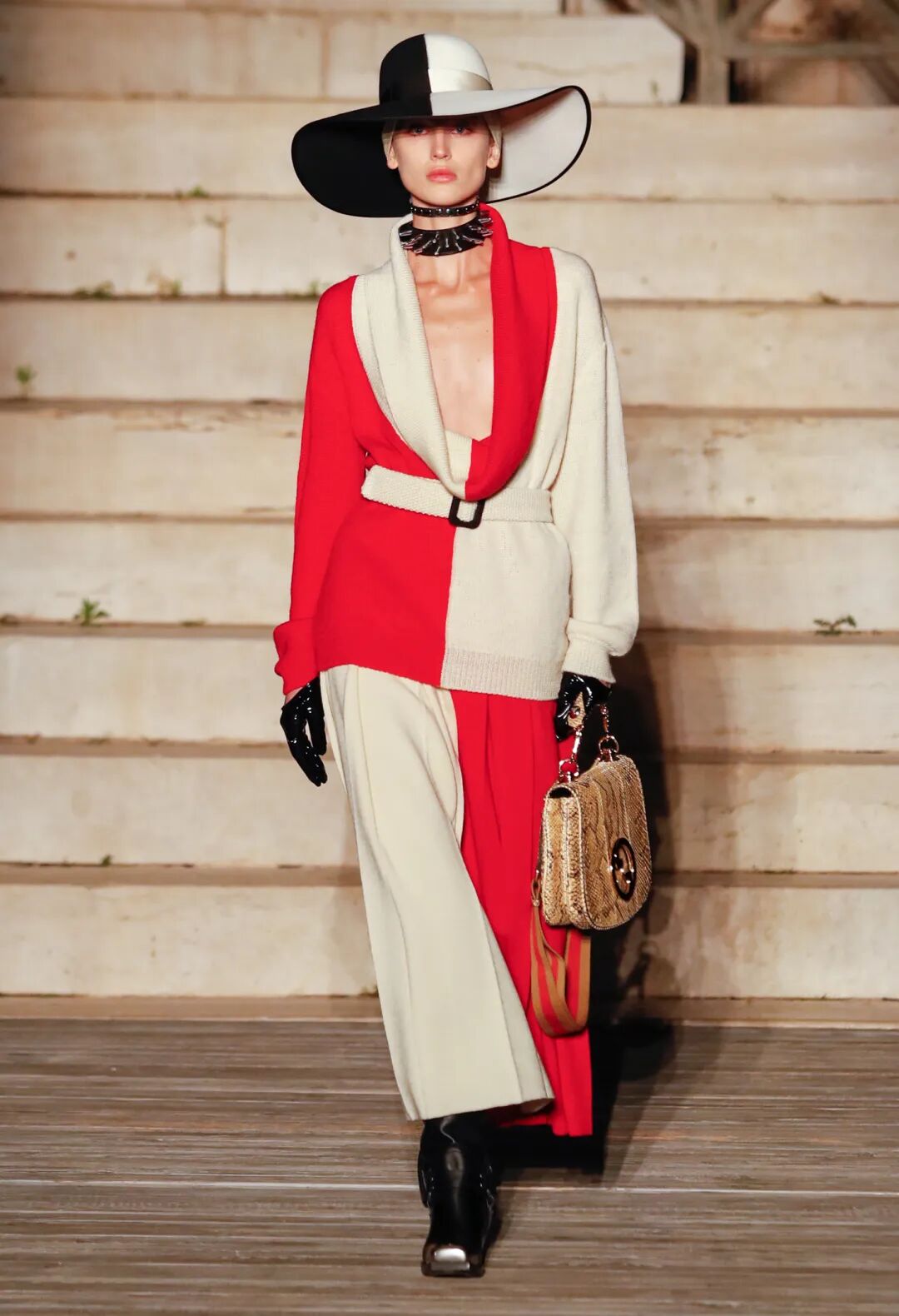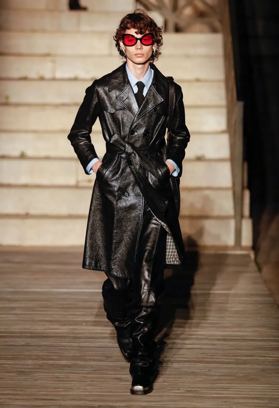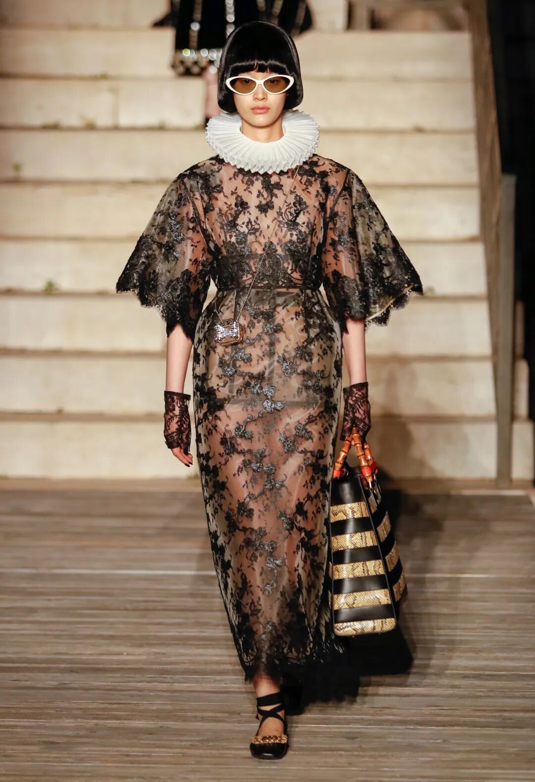正如秀场中展现出无序纷杂却相互关联统一的氛围,Cosmogonie 有着将看似无关事物联系起来的意义。Michele 在秀场笔记中透露,本场秀的关键词“Cosmogonie”源于哲学家 Walter Benjamin 的一篇专文,而在意大利南部的这个美好夜晚,Alessandro Michele 通过 Cosmogonie 系列所展示的庞大阵容则是对宇宙中的连通性进行了一番独特追寻与探索。
