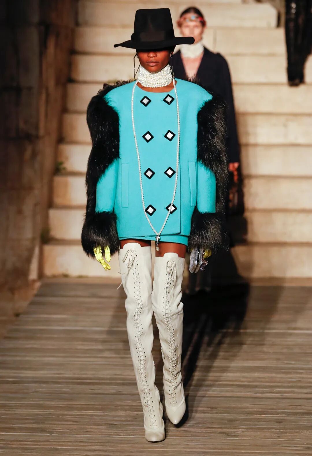 秀场搭建在意大利的蒙特城堡,Michele 希望这场秀的主题是为那些历史悠久的地点带来活力与生机。而这座建造于 13 世纪的古老城堡中充满了精巧结构,就如同 Michele 的设计一般,以繁复的方式赋予平凡细节的意义。