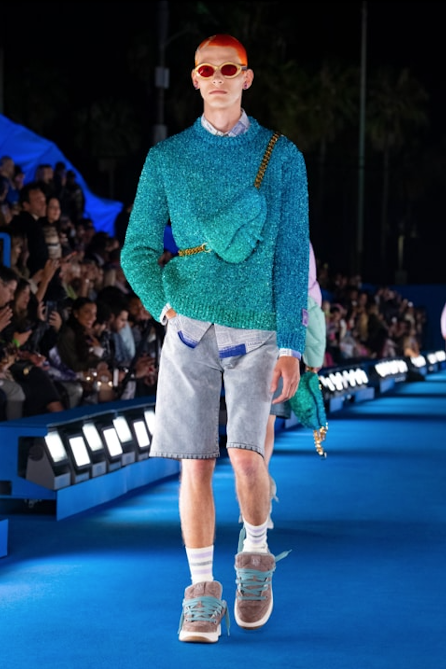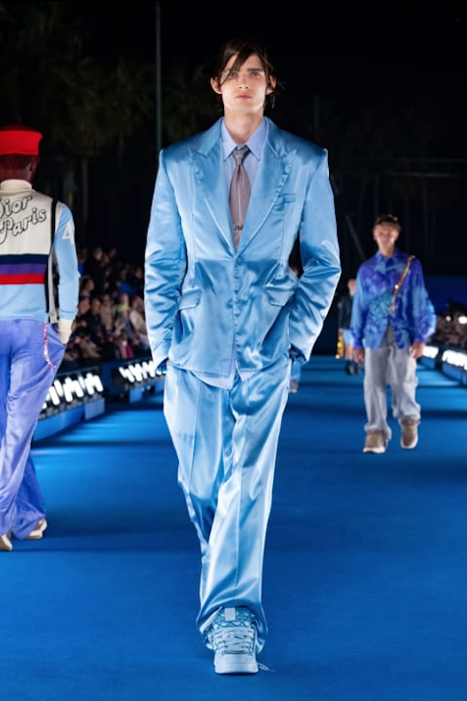 Dior 在威尼斯海滩边布置了一条蓝色海洋主题的秀场,在此呈现了融合加州滑板、冲浪文化与 Dior 正式奢华标准的 40 套男装造型。该系列的各种西装、夹克有着飘逸且分层的设计,闪亮的丝质材料裤子再度柔化了传统剪裁。除了创意套装之外,设计中不乏标着闪亮细节 “California Couture” 字样的毛衣、镶有亮片的篮球短裤,以及柔软的背心和毛衣。