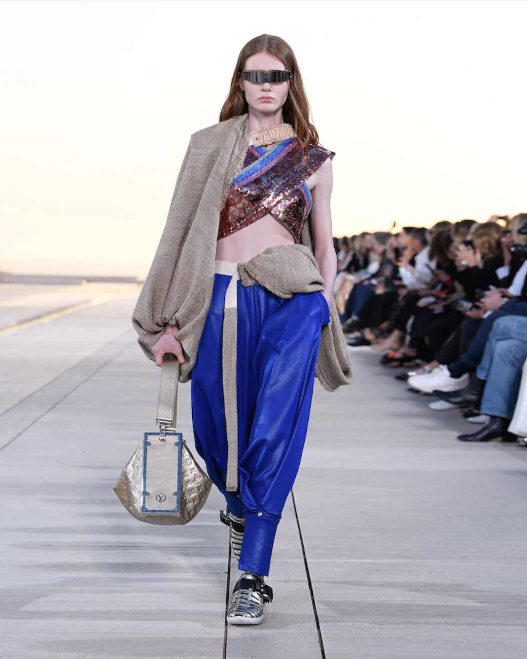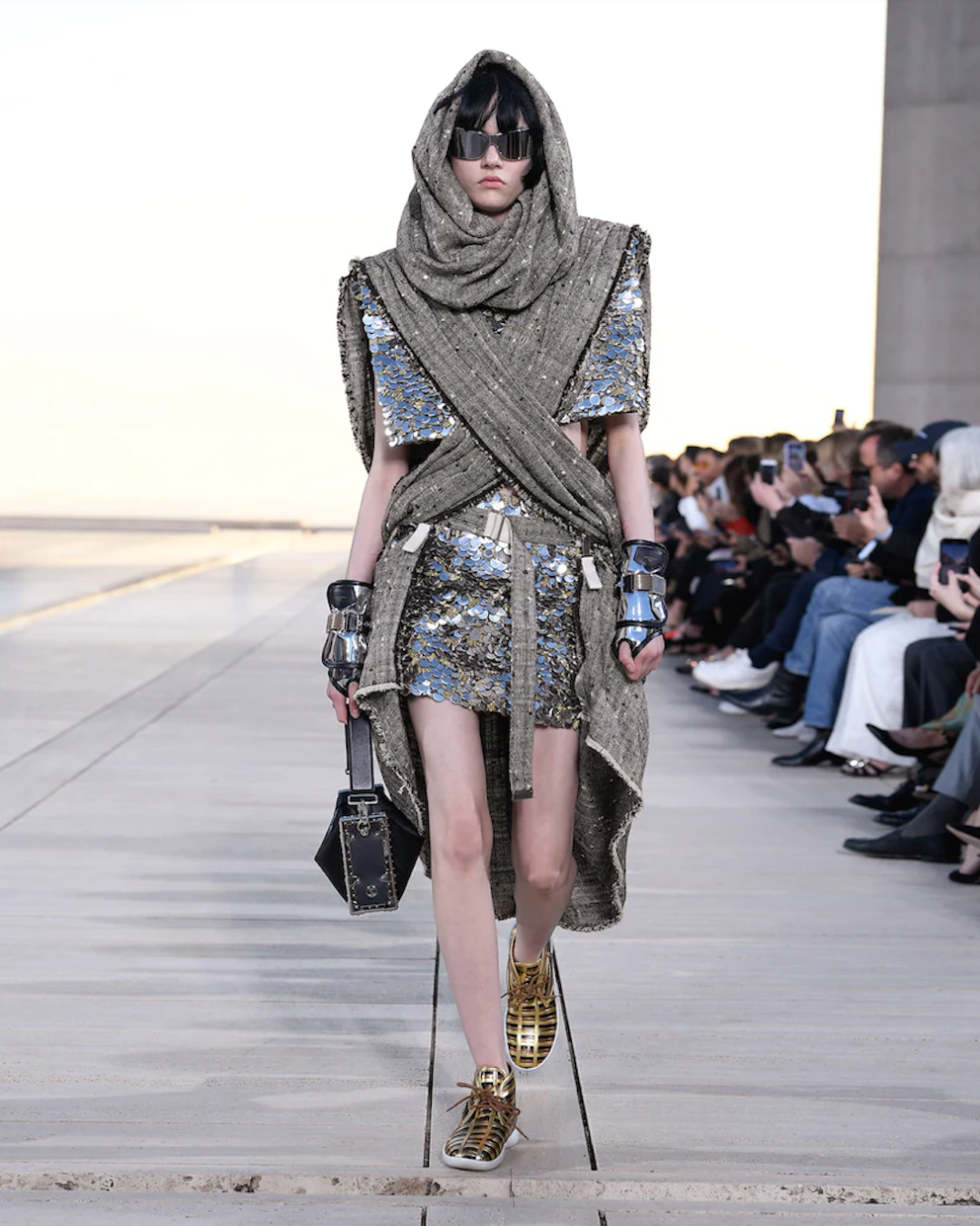 拉霍亚海岸的落日余晖下,耀眼的金属色与镜像混凝土建筑相得益彰。由谷爱凌为首的一众 Louis Vuitton 模特们身穿超大廓形的服装在烈日前穿梭行走。本季采用的设计元素包括极致的垫肩、结构式长袍和饰有大号亮片的半身裙,共同勾勒出了一副极具未来主义感的古希腊女神群像。