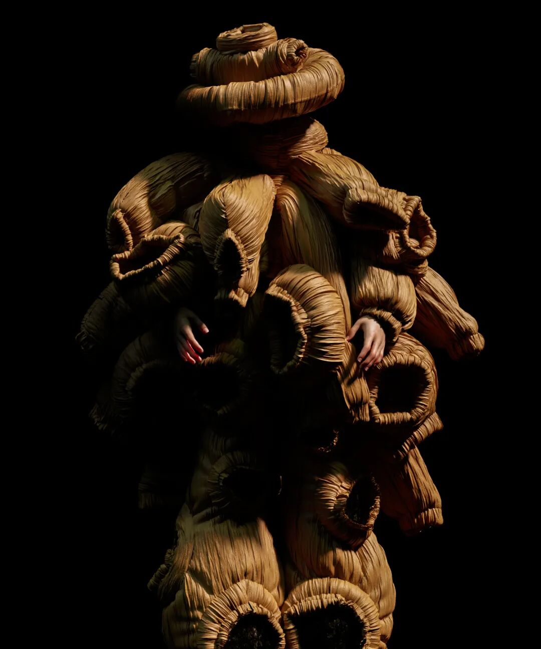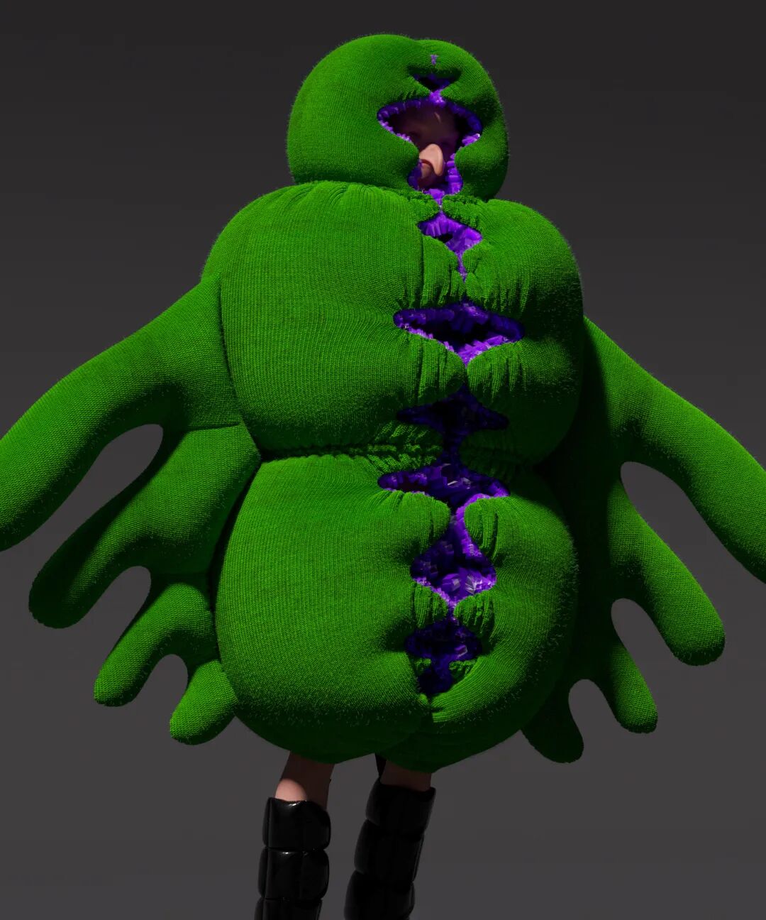 在后面的时间里,我们共同商讨服装的设计和细节,以及背后概念的完善,一起确定结构和廓形,讨论可行性,在 3D 部分 Chen Peng 也给了我很多启发和帮助,并最终由我独立完成了所有视觉的创造。这其中最困难的部分,是服装的制作。要知道 Marvelous Designer 可以创造虚拟服装,操作逻辑其实跟现实中的服装制作很相似,都是板片绘制、剪裁、缝合这样一套流程,但我们构思的那些服装十分抽象,几乎无法在现实中完成。不过好在我们都有丰富的创作经验,在不断地尝试、克服技术难关后,最终完成了这组作品。