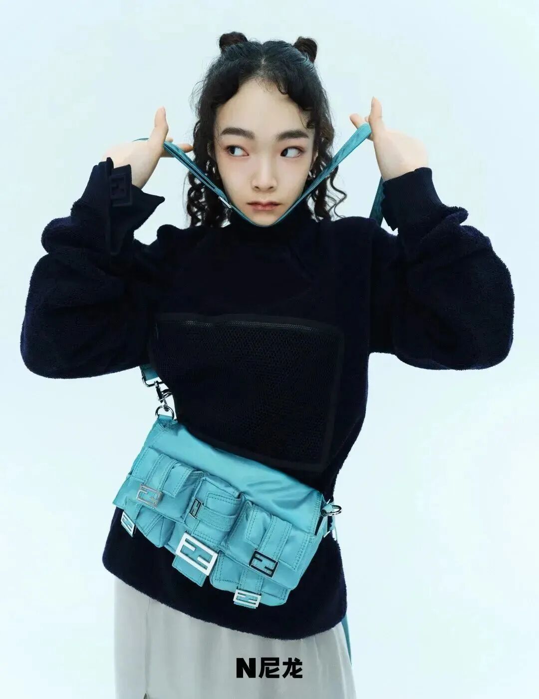绿松石色长袖针织衫、黑色 Fendi Roma 针织背心