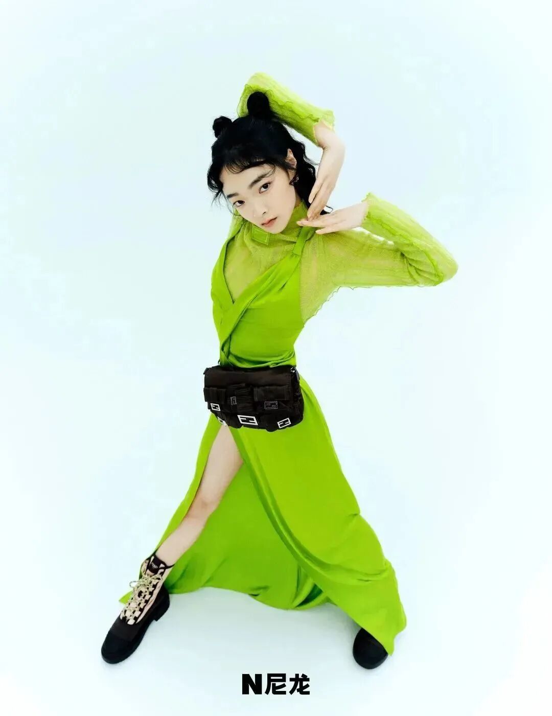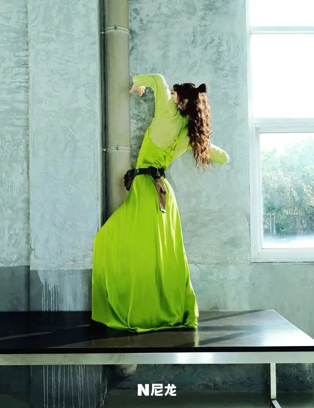 嫩芽绿尼龙和马海毛毛衣、嫩芽绿缎面连衣裙、