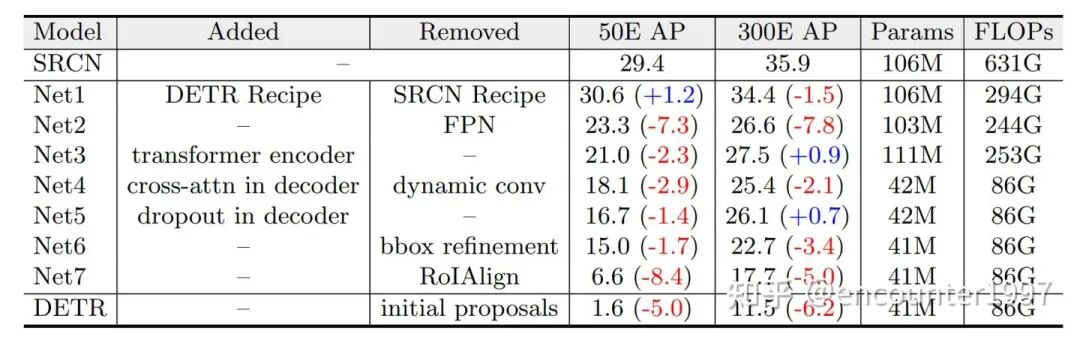 为了从模型转化中获得insightful的结果,我们需要选择合适检测器展开实验。综合一下因素,我们选择Sparse RCNN和DETR来展开实验:(1)它们分别是RCNN和Detection Transformer中有代表性的检测器;(2)二者有很多相似的地方,比如相同的优化器、标签匹配、损失设计、数据增强和端到端等,这有利于我们尽可能排除其他影响因素的干扰,专注于核心的区别;(3)二者在data efficiency上存在显著差异。模型转化过程如表1所示,接下来,我们挑选模型转化中的关键步骤进行介绍: