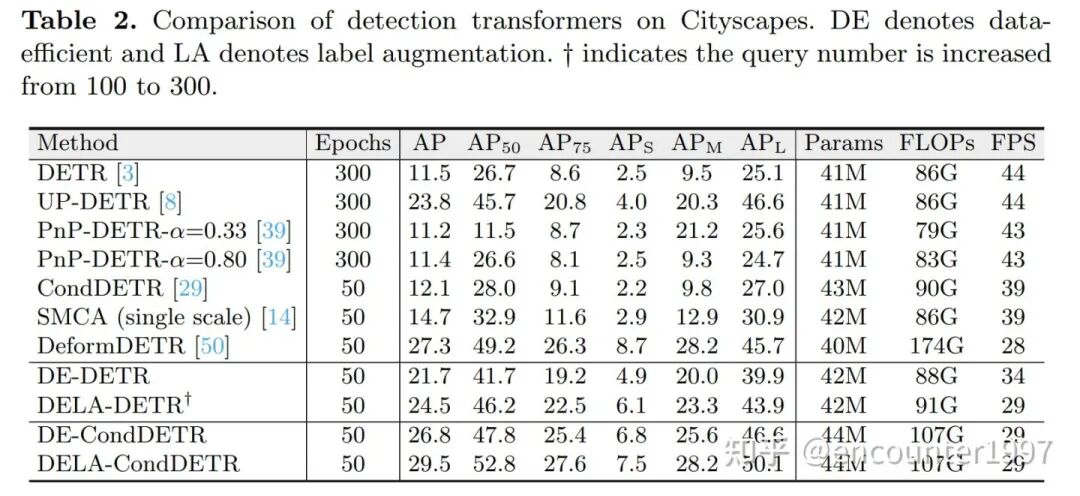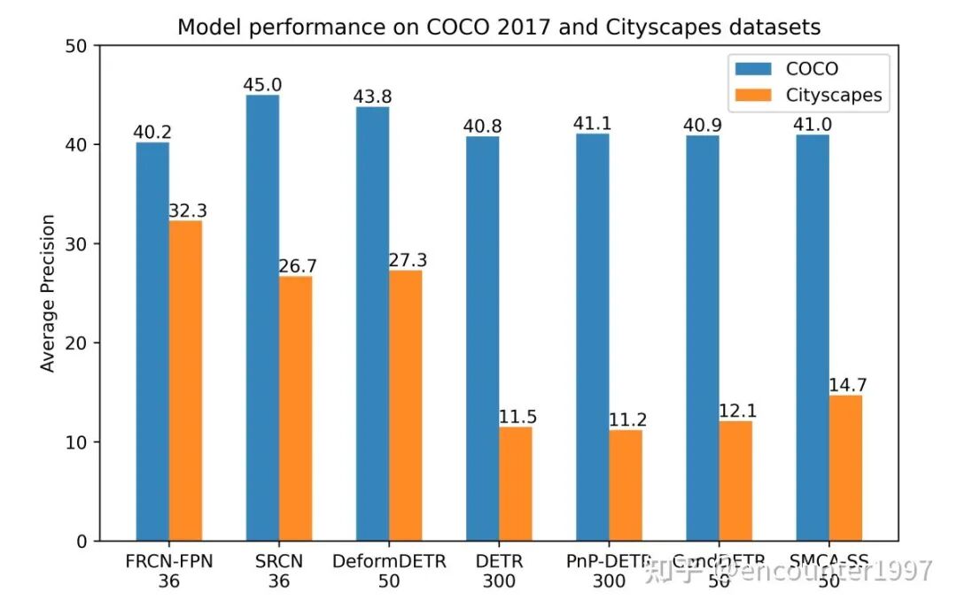 目前的研究似乎表明Detection Transformers能够在性能、简洁性和通用性等方面全面超越基于CNN的目标检测器。但我们研究发现,只有在COCO这样训练数据丰富(约118k训练图像)的数据集上Detection Transformers能够表现出性能上的优越,而当训练数据量较小时,大多数Detection Transformers的性能下降显著。如图1所示,在常用的自动驾驶数据集Cityscapes[8](约3k训练图像)上,尽管Faster RCNN能够稳定的取得优良的性能,大多数Detection Transformers的性能显著下降。并且尽管不同Detection Transformers在COCO数据集上性能差异不到2AP,它们在小数据集Cityscapes上的性能有大于15AP的显著差异。