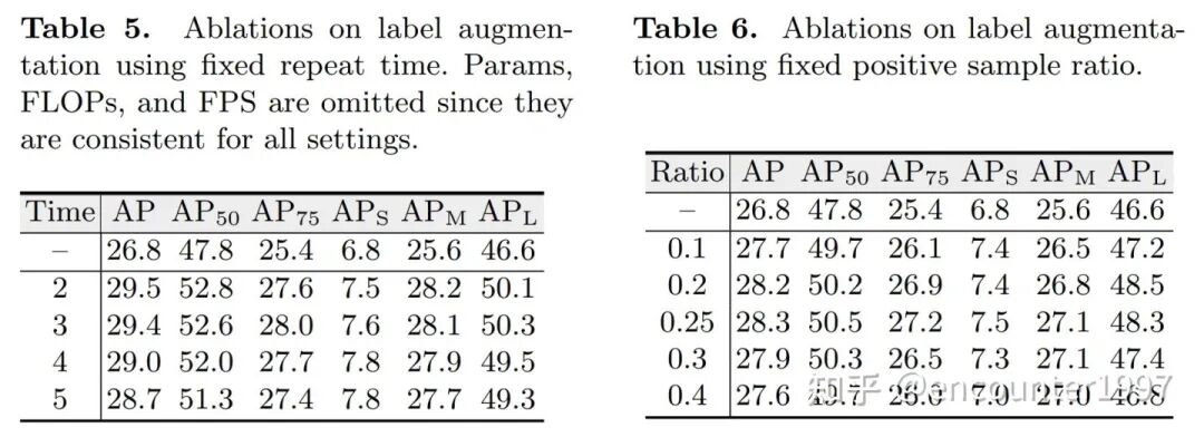 如方法部分中讨论的,我们考虑了两种标签增强策略。包括固定重复次数和固定正负样本比例。在本部分,我们对这两种策略进行消融。如上表中左表所示,使用不同的固定重复倍数均能够提升DE-DETR的性能,但随重复次数增加,性能提升呈下降趋势。我们默认采用重复正样本标签2次。此外,如右表所示,尽管使用不同正负样本比例均能带来性能提升,在正负样本比例为1:3时,其取得的性能最佳,有趣的是,这也是RCNN系列检测器如Faster RCNN中最常用正负样本采样比例。