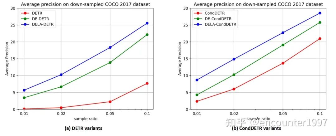 尽管以上实验说明了我们的方法能够在数据量有限的情况下显著提升模型性能,它并不能表明我们的方法在数据量充足时依然有效。为此,我们在数据量充足的COCO2017上测试我们方法的性能。有趣的是,我们的方法不仅不会降低模型在COCO 2017上的性能,还能带来不小的提升。具体来说,DELA-DETR和DELA-CondDETR分别相较于它们的baseline提升8.1AP和2.8AP。