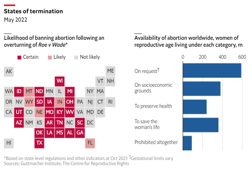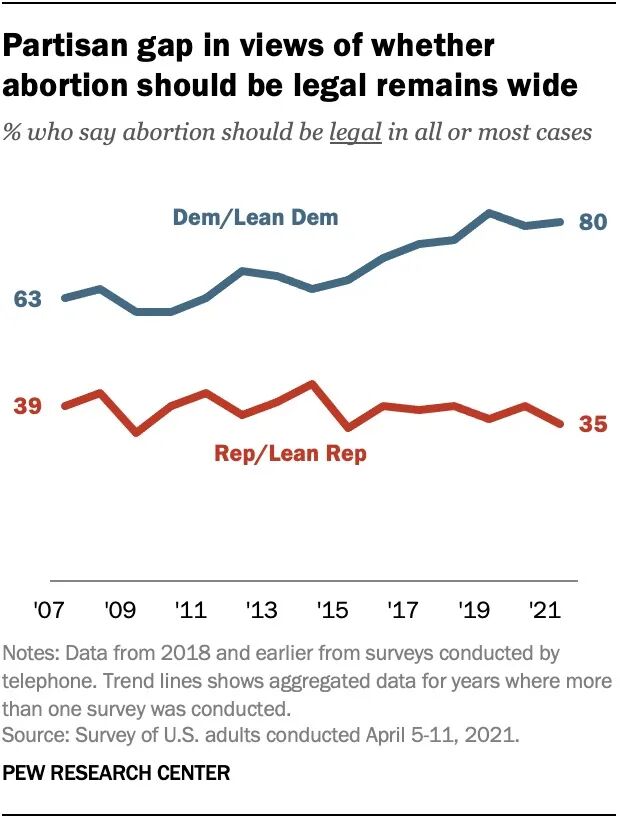 堕胎在美国是一个长期的社会话题,它按照党派、意识形态和宗教形成了极端分裂的不同意见。根据皮尤研究中心(Pew Research Center)的民意调查,59%的美国成年人认为堕胎在绝大多数或所有情况下应该合法,而39%的美国成年人认为堕胎在任何情况下均应属非法。但是,以党派分类,有80%的民主党支持者认为堕胎合法,而只有35%的共和党人认为堕胎合法。