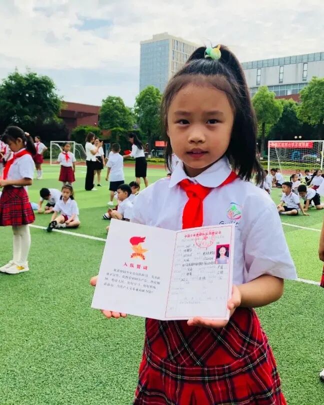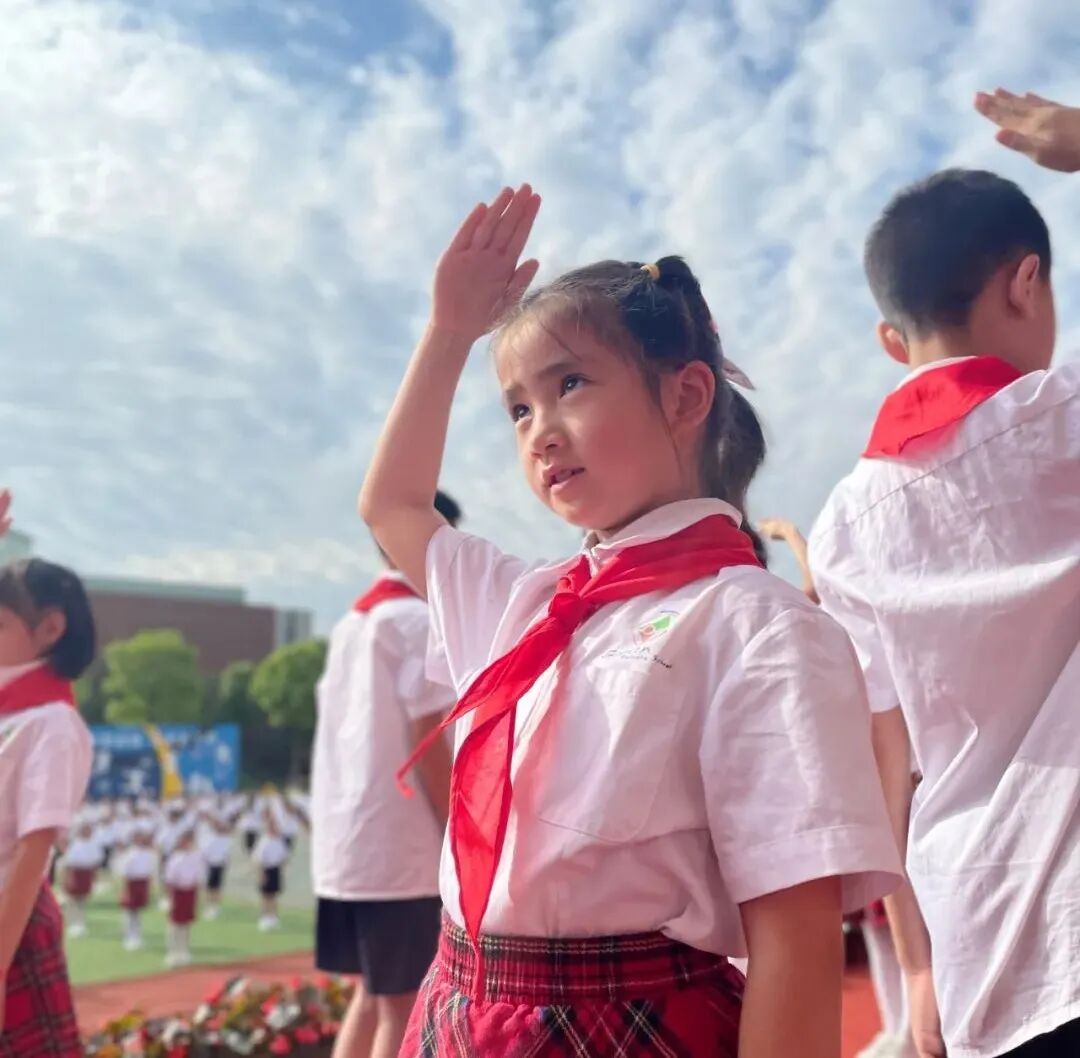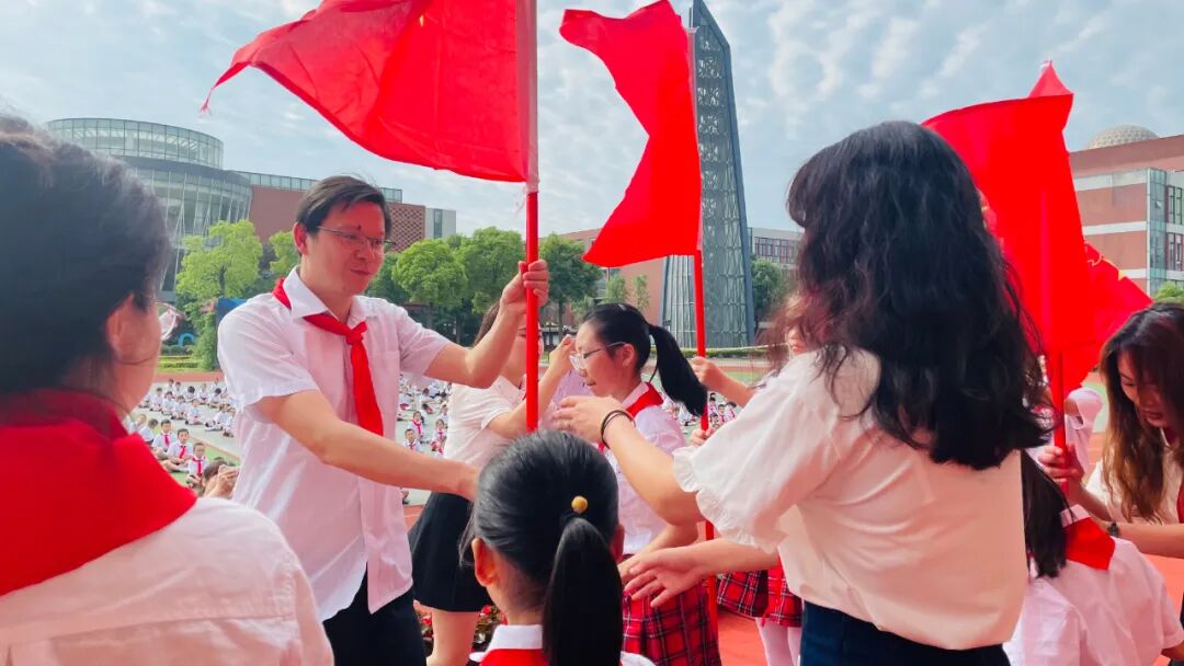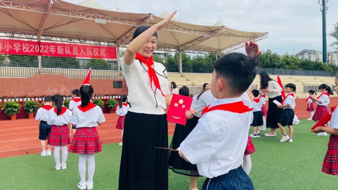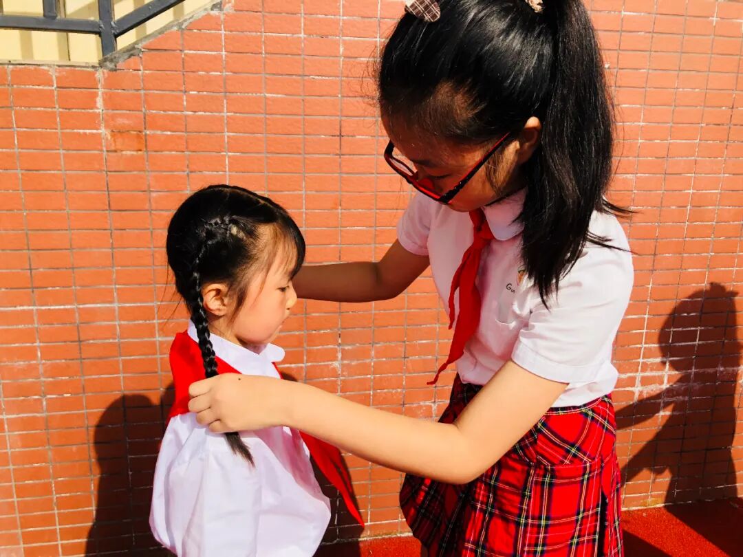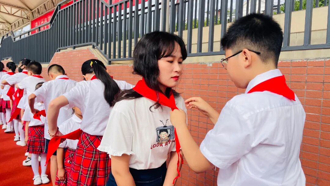 大队长蒋婧屿宣读新队员名单,五年级老队员为新队员佩戴上崭新的红领巾。鲜艳的红领巾飘扬在胸前,新队员的脸上都洋溢着激动与自豪。