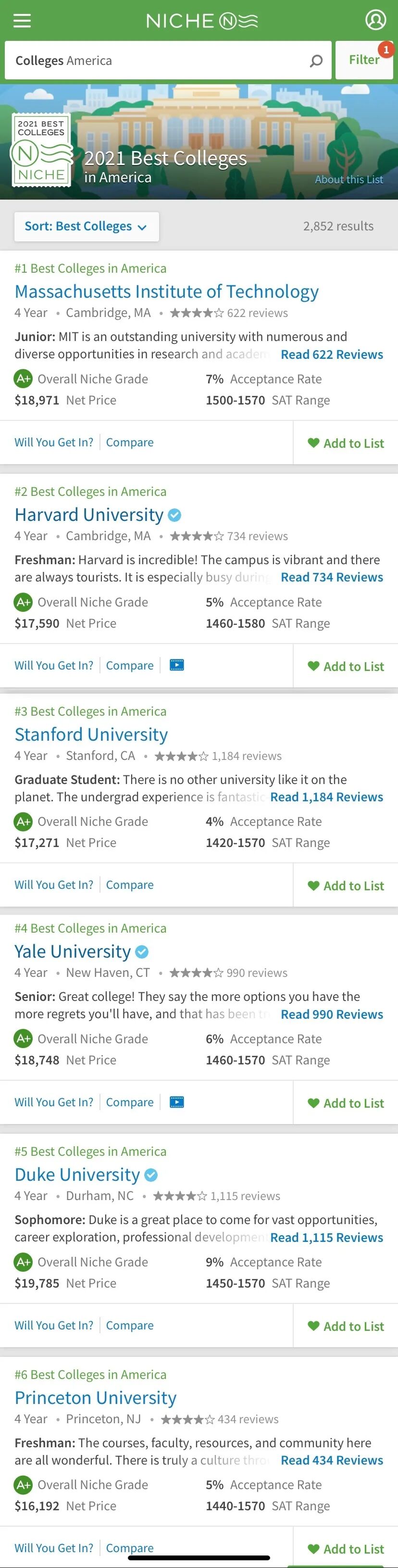 与上述四大排名不同的是,Niche排名更接近学生的真实体验与反馈。Niche有超过18万条来自学生的真实评论,涵盖了从师资力量、学术水平到住宿环境、校园生活等学生所关心的方方面面,号称互联网上最全面的大学信息平台。在美国,超过一半的高中生都使用Niche平台寻找心仪的大学。Niche也被称为美国大学版“大众点评”——想知道这些大学到底好不好,学生亲口说了算!