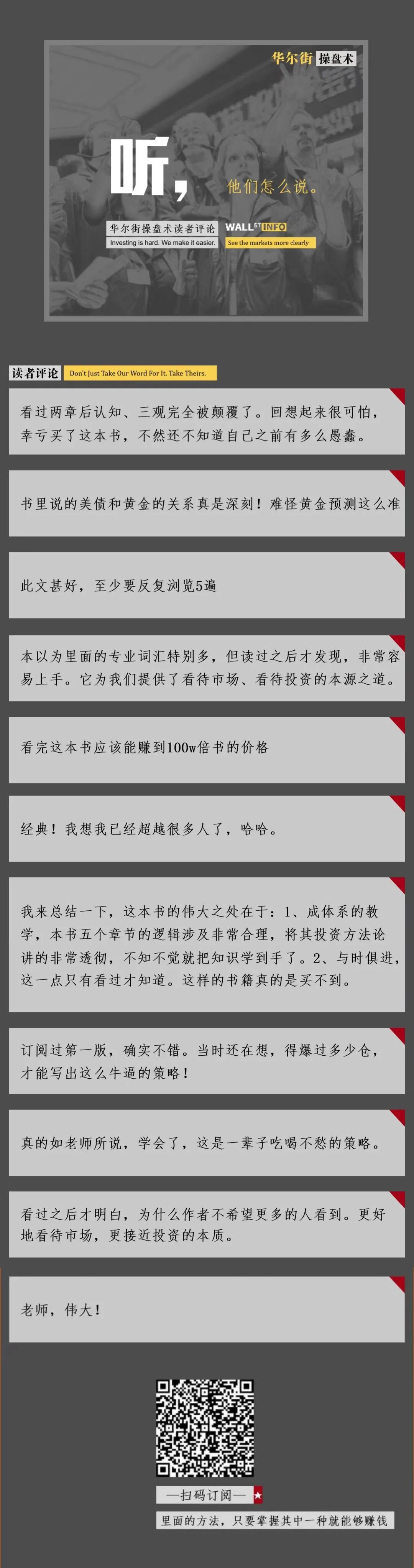 事态的发展清晰地告诉我们,基本面不是一成不变的,技术面更是时刻变化。如果大多数的机构都在玩低买高卖的游戏,散户就只能认赔出场。如果你觉得你的思维总是被牵着鼻子走,说明你还没有真正的懂市场,可订购《华尔街操盘术2.0版:与大众为敌》,系统性的学习交易方法论,更深刻地了解金融市场。这是一本与时俱进的书籍,里面讲述的分析方法、交易理论全部是结合实战得出。它能够在短期内帮助你学习整套交易方法论,抢劫那些时刻准备抢劫你的人。可识别下方二维码或点击文末的“阅读原文”订阅。
