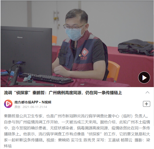 2021年8月,秦鹏哲同志作为国家联防联控机制河南工作组成员前往河南郑州协助开展“河南7·30”疫情的流调溯源工作。在豫工作期间,他深入现场和郑州六院传染病区勘查,通过开展病例访谈、空气动力学实验的细致调查,描绘出河南本轮疫情167个病例的传播主线,协助当地开展疫情形势研判,及时提出防控措施建议。他毫不保留地将广东经验和广东打法分享给兄弟省份,他的专业技术水平、丰富的现场工作经验和缜密的流行病学思维在疫情处置中得到充分体现,为“河南7·30”疫情的有效控制和防外溢工作作出了积极贡献,得到了国家联防联控机制和河南省、郑州市的充分肯定。近日,湛江出现本土疫情,秦鹏哲同志继续前往支援。惟其艰难方显勇毅,惟其笃定方显珍贵,疾控人,一直在路上!