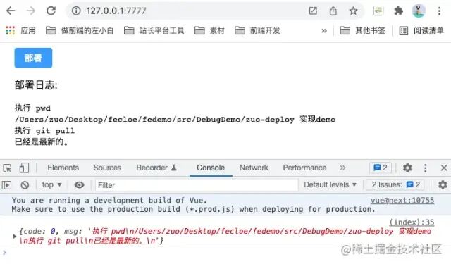 最近写了一个自动化部署的 npm 包 zuo-deploy[1],只需点击一个按钮,就可以执行服务器部署脚本,完成功能更新迭代。客户端使用 Vue + ElementUI,服务 koa + socket + koa-session 等。基础功能代码 300 行不到,已开源在 github。zuoxiaobai/zuo-deploy 欢迎 Star、Fork。这里介绍下具体实现细节、思路。