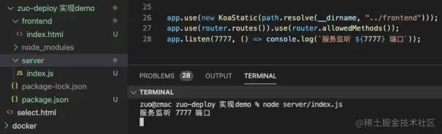 在 start.js 中,我么可以将 server/index.js 的代码全部拷贝过去即可完成 zuodeploy start 开启服务,点击部署的功能