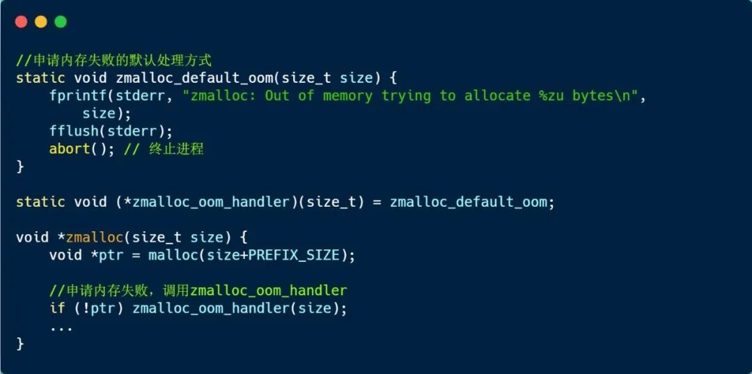 可以看到,当 zmalloc() 申请内存失败的时候,就会打印一条日志,并调用 abort() 终止 Redis 进程。