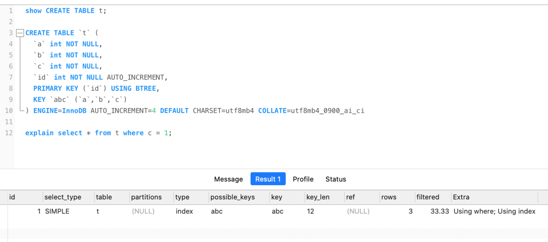 但是执行计划里的 type 是 index,这代表着是通过全扫描联合索引树的方式查询到数据的,这是因为 where c 并不符合联合索引最左匹配原则。
