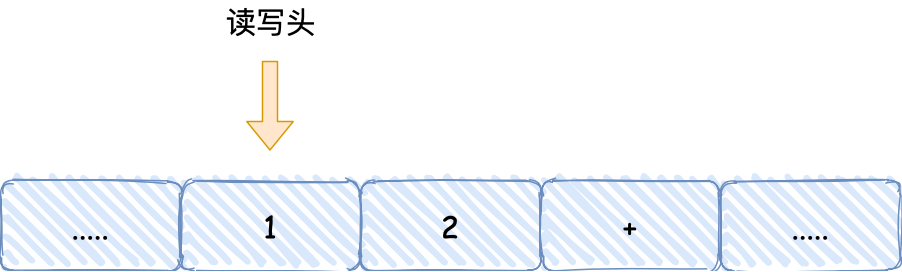 首先,用读写头把 「1、2、+」这 3 个字符分别写入到纸带上的 3 个格子,然后读写头先停在 1 字符对应的格子上;