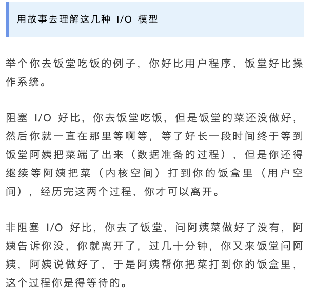 还有很多知识其实可以结合生活中的场景来记忆,这样想忘记都难,比如阻塞 IO、非阻塞 IO、同步 IO 和异步 IO,我之前文章用去饭堂打菜的场景来介绍它们之间的区别。