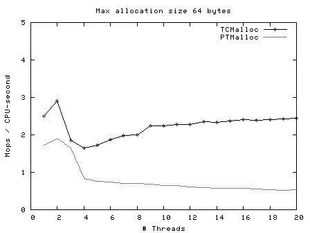 下图是 TCMalloc 作者给出的性能测试数据,可以看到线程数越多,二者的速度差距越大,显然 TCMalloc 更具有优势。