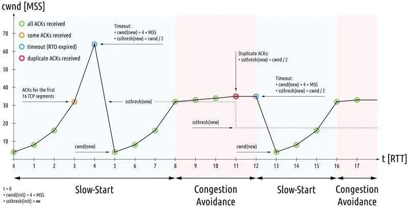 传统的拥塞控制分为四个部分:慢启动、拥塞避免、快速重传、快速恢复,如下图: