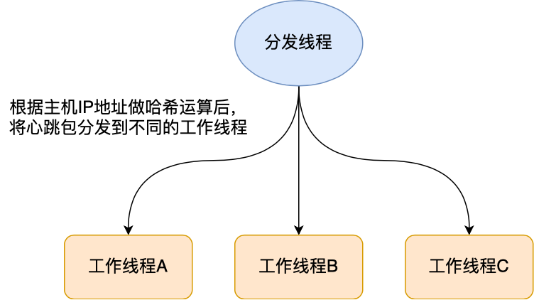 分发的规则可以用哈希函数,这样在接收到心跳包后,解析出主机的 IP 地址,然后通过哈希函数分发给工作线程处理。