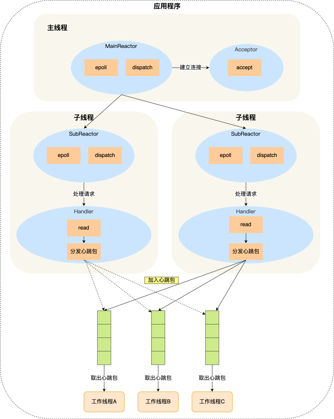 分发线程和工作线程之间可以加个消息队列,形成「生产者 - 消费者」模型。