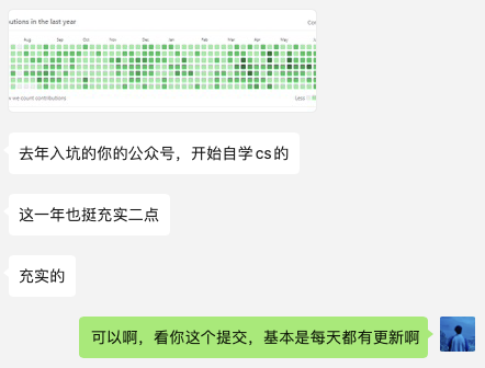 他从那时起,就日复一日的学习,并在 Github 有做笔记的习惯,你看他的提交记录,每天都有,一天都没拉下,就这样坚持了一年。
