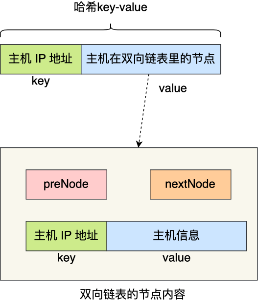 双向链表存储的内容必须包含主机的 IP 信息,那为了更快查询到主机的 IP,双向链表存储的内容可以是一个键值对(Key-Value),其 Key 就是主机的 IP,Value 就是主机的信息。
