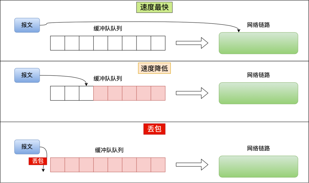 当缓冲队列开始有报文挤压,那么网速就开始变慢了,也就是网络延时变高了;