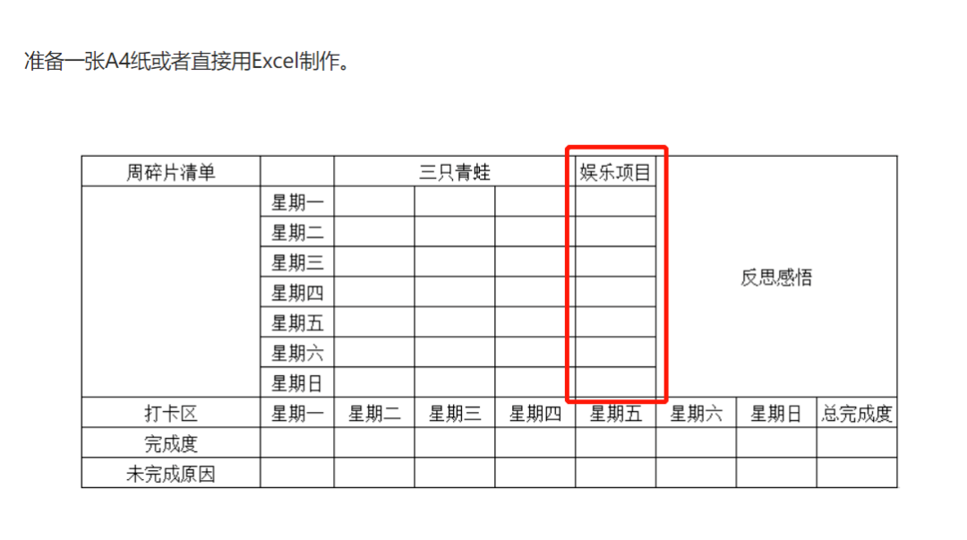 比如,我在以前分享的周计划模板里,专门设置了一栏娱乐项目;