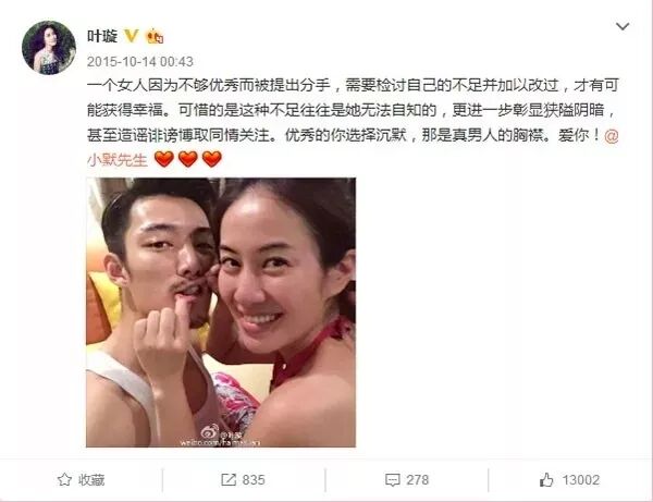 小默先生前女友写了一篇《珍惜生命,远离渣男》的文章,爆料小默先生“一脚踏两船”,叶璇便各种发文讽刺前女友“不够优秀而被提出分手”,又嘲她“用造谣诽谤博取同情”。