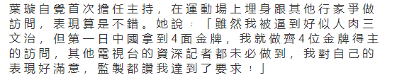 由于精通中英法三语,叶璇曾被派到雅典奥运担任直播主持,不过这也是叶璇在TVB时期翻车最严重的一次。