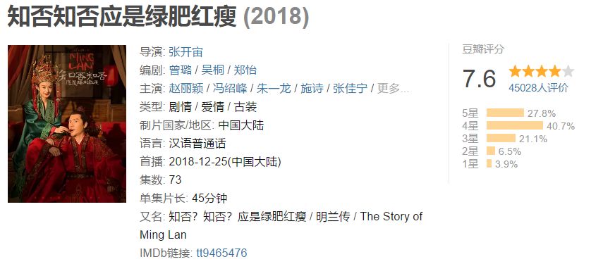 我看了一下,批评的声音大多是觉得剧情节奏慢。这个也不出意外,毕竟七十多集的剧,要讲好几个家族的故事。但在硬件上,《知否》基本没有什么毛病可挑。