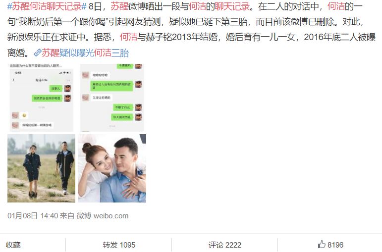 苏醒晒了几张和何洁的聊天记录,大家猜测何洁可能生三胎了。