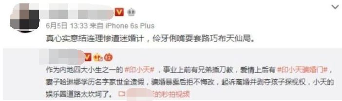 有媒体收到爆料,称印小天离婚了,原因是妻子哈琳娜(本命赵颖燕)骗婚。