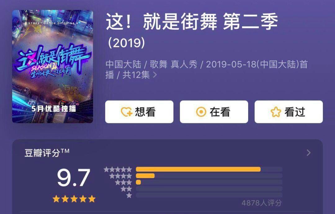 这一季《这就是街舞2》首播当天在豆瓣的评分惊到我了,居然高达9.7分。