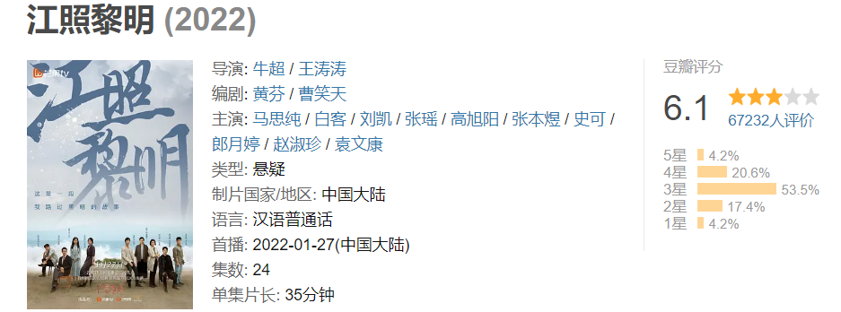 每一年都有剧的评分曲线是高开低走,今年国剧评分的第一跳来自于马思纯的《江照黎明》,开分7.8,结局6.1。