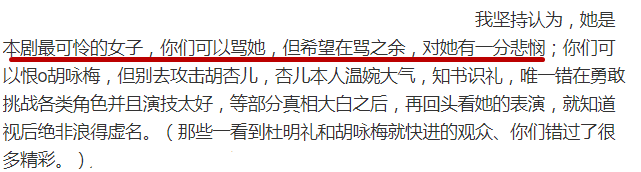 汹涌的怒意甚至漫延到真身胡杏儿的微博留言区,编剧老师苏晓苑也看不过眼了,撰文解释:她是本剧最可怜的女子。