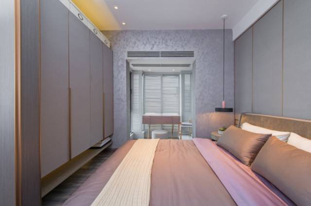 主卧色调配合整个房屋的灰色,将阳台并入屋内成为落地窗。
