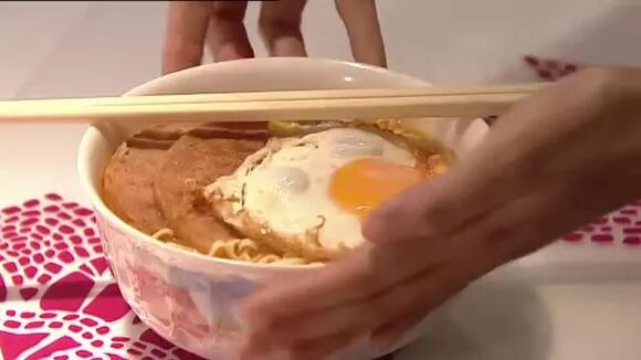 勺子在低,云吞居中,面条在上面,只见面条而不见云吞……此举是为了面条不会被汤水泡得太软,所以勺子和云吞要把面条垫高。