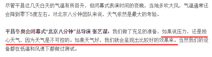 ——直到临演出,张艺谋还处于“万事皆备,只怕妖风”的担忧状态。毕竟之前也有过因为“天气问题”不让上台彩排的情况,人家主场大过天嘛……