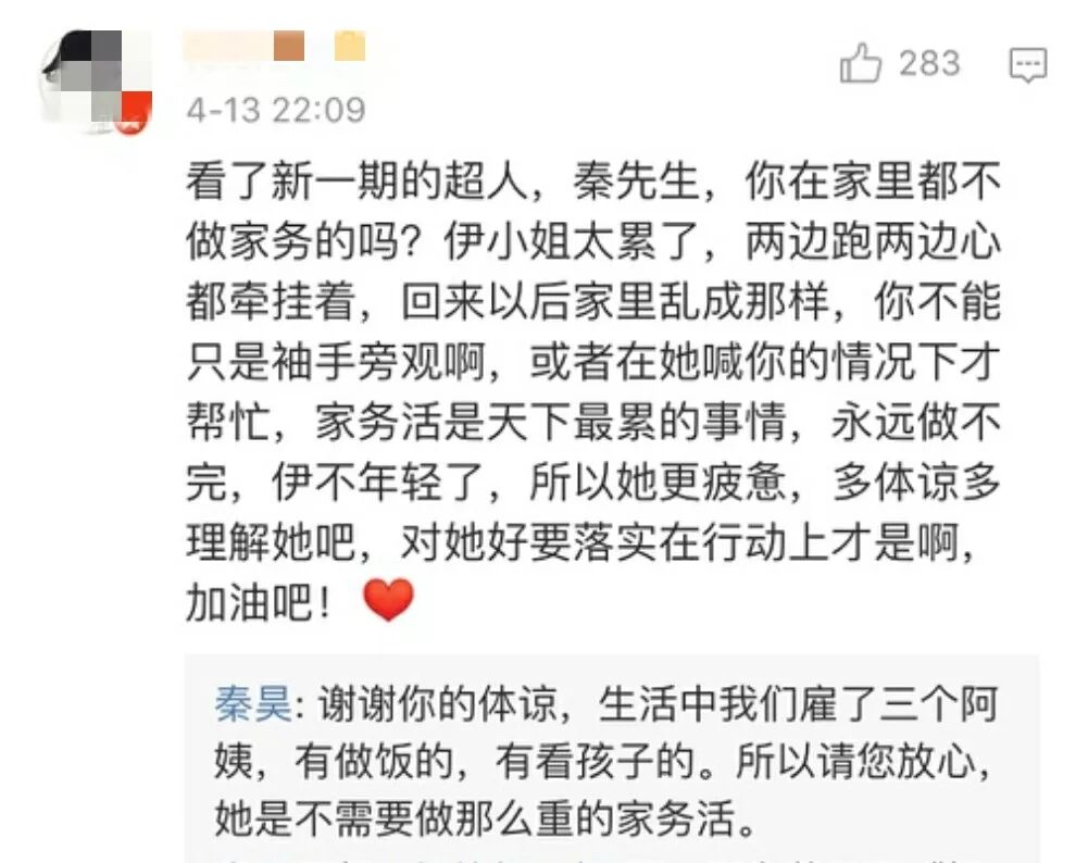 而对“伊能静很辛苦,秦昊却整天打游戏”的说法,他也在微博上做出了回应,透露自己家请了三个保姆,言外之意都是“节目效果”。