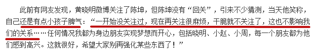 虽然做了澄清,但不和的传闻愈演愈烈,10年又被扒出黄晓明微博关注了陈坤,陈坤却没有回粉,后来又解释说是自己小孩子脾气...