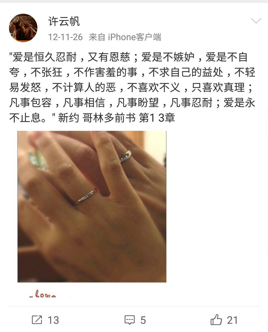 不过12年许云帆又回了加拿大。也是在这一年许云帆认识了演员何音,在微博上频繁互动。