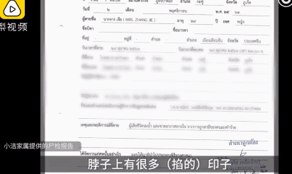 最后泰国方面出具的验尸报告也显示,小洁两侧手臂、胸部、肩部都有伤口,肋骨折断,腹内有出血,肝脾肾脏都受损,死因为“溺水”,印证了生前遭受严重殴打的说法。