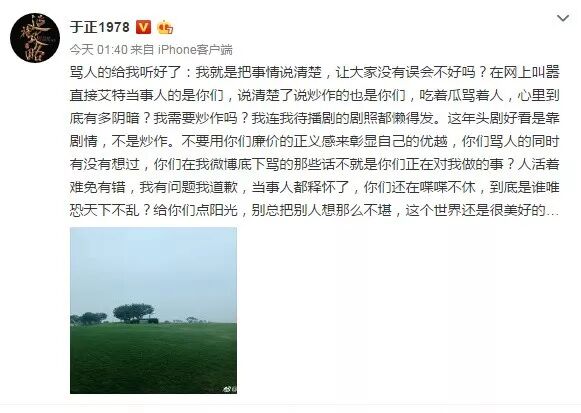 关于于麻麻还有一个比较沙雕的新闻,2013年网传沈泰女友被于正旗下男演员“睡了”,承诺好的角色又没有,沈泰在咖啡厅直接动手打了于正,还在微博上大方承认了。(打人的这个咖啡馆还在我小区门口2333)