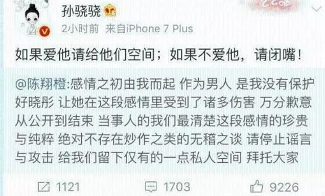 2017年10月两人微博宣布分手,陈翔也道歉了,不过这话说得很微妙,让人一看就知道有八卦。