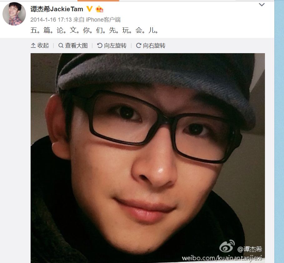 不知道是不是这个原因,女朋友情绪非常不好,在人人网公开diss谭杰希各种装,还吐槽本来就是他追自己,自己巴不得赶紧分。