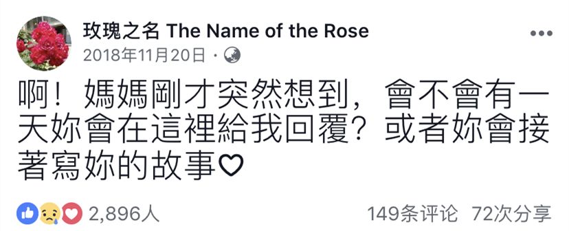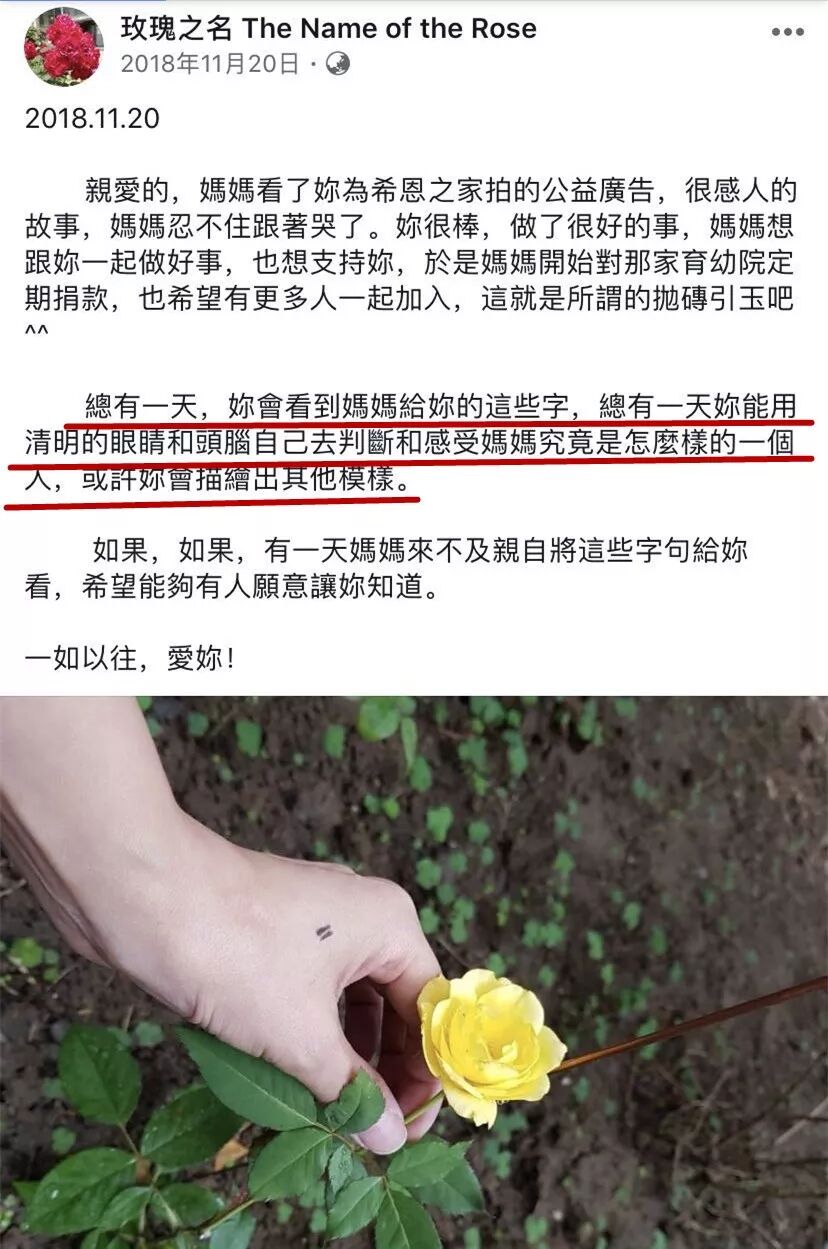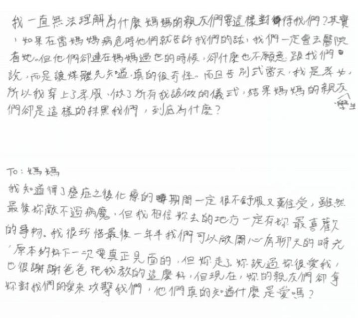 她还在最后喊话妈妈:“我知道得了癌症之后化疗的期间一定很不舒服又难受,虽然最后你敌不过病魔,但我相信你去的地方一定有你最喜欢的事物。我很珍惜最后一年半我们可以敞开心房聊天的时光,原本约好下一次要真正见面的,但你走了。你说过你很爱我,也很谢谢爸爸把我教得这么好,但现在,你的亲友们却拿你对我们的爱来攻击我们,他们真的知道什么是爱吗?”