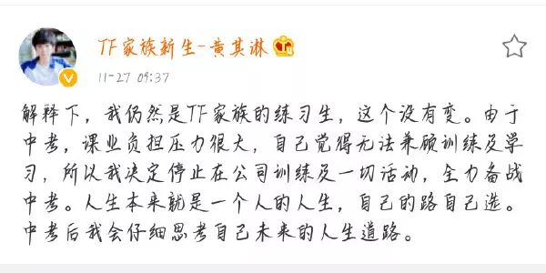 之后还不到三个月,黄其淋就在小号发了“I quit”的微博,暗示离开公司。此时他和时代峰峻的合约已到期,没有续约,做了一段时间素人。